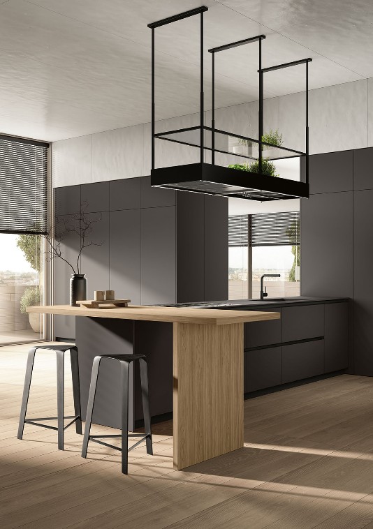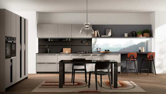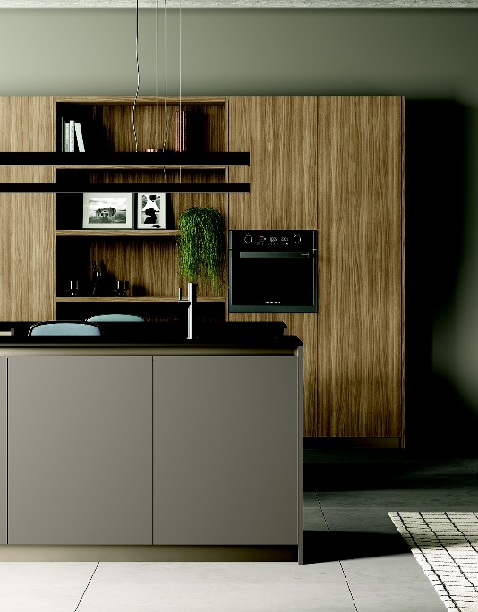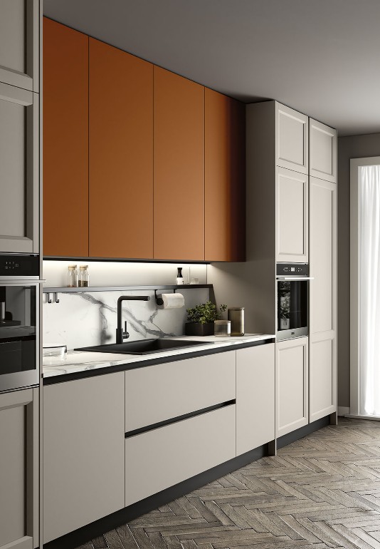 Il colore torna protagonista assoluto dell’abitare. Il Terracotta laccato opaco dei pensili è un tocco eclettico che gioca con il Grigio Oxford laccato opaco delle ante di basi e colonne e con le raffinate, ma praticissime, aperture a gola nere.