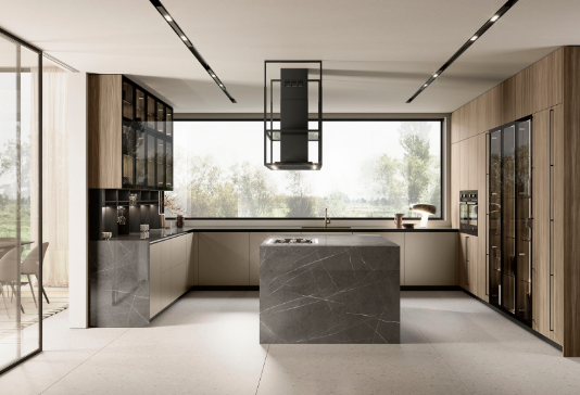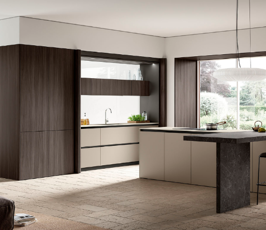 Una soluzione elegante dalle tonalità calde caratterizzata dall’anta sagomata a 37 gradi che diventa presa maniglia. Al centro della scena dominano le due isole che permettono agli ospiti di vivere la convivialità senza rinunciare al comfort.