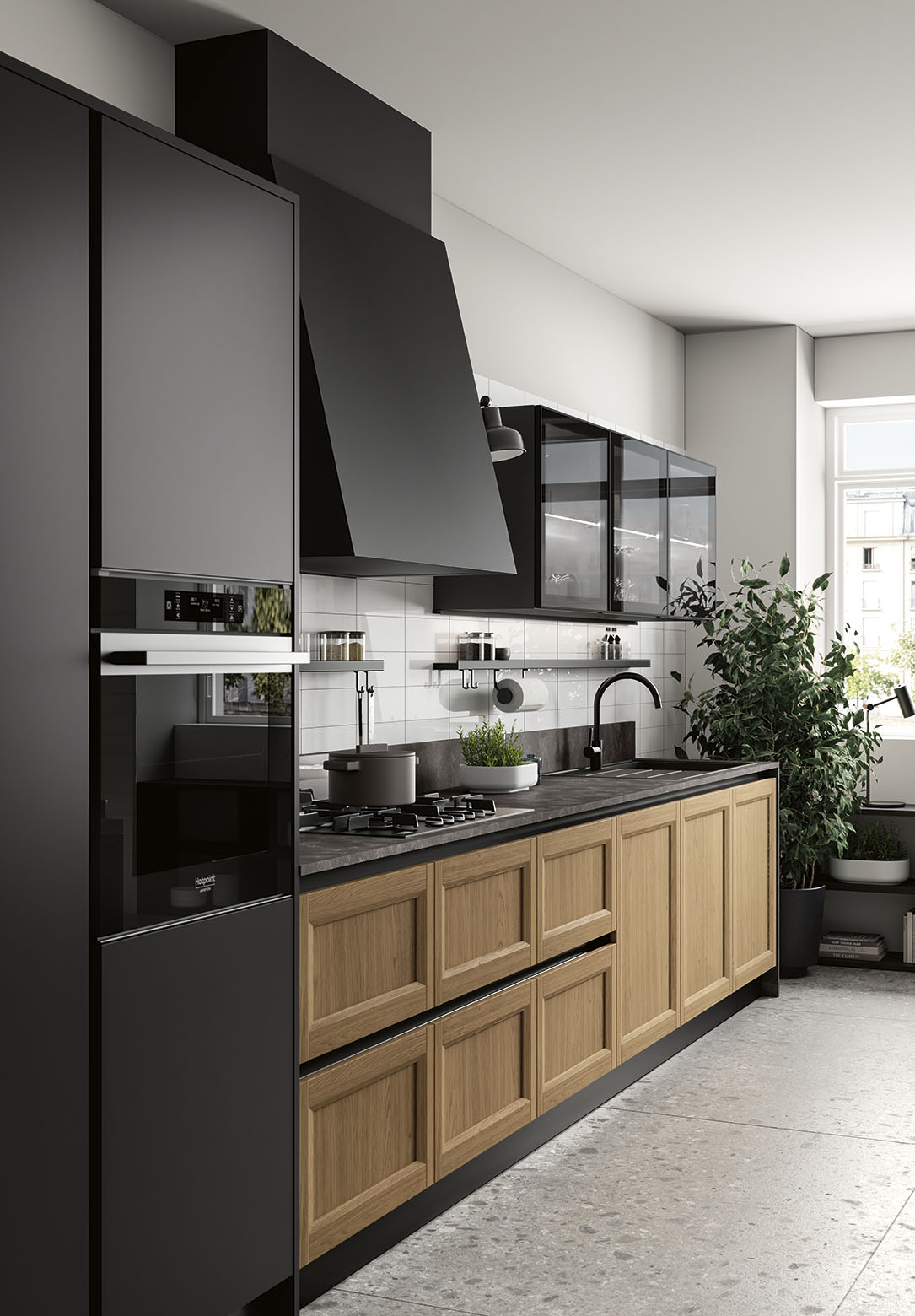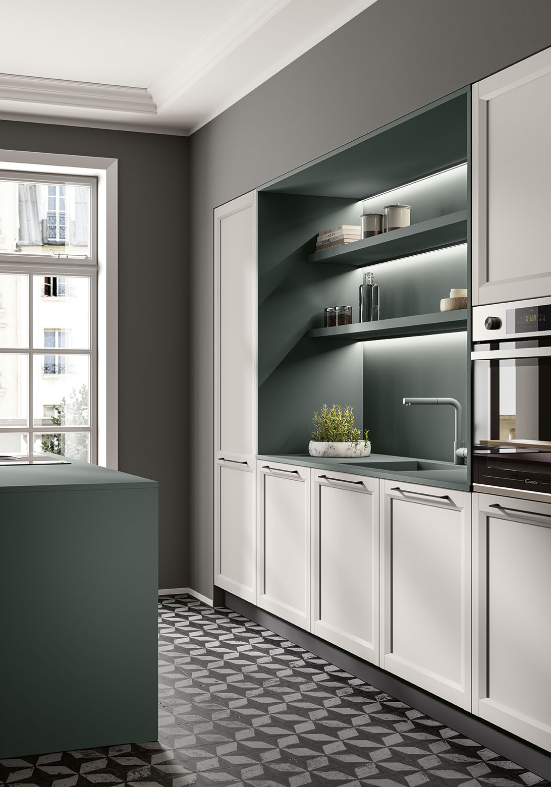 Un equilibrio tra stile classico e contemporaneo, unito a una componibilità versatile: l’anta a telaio Futura dà forma a uno spazio raffinato e senza tempo, facilmente declinabile in diverse interpretazioni stilistiche, anche attraverso un elegante mix con ante lisce. Disponibile in legno o laccato opaco, si abbina sia ad aperture a gola che a soluzioni con maniglia.
