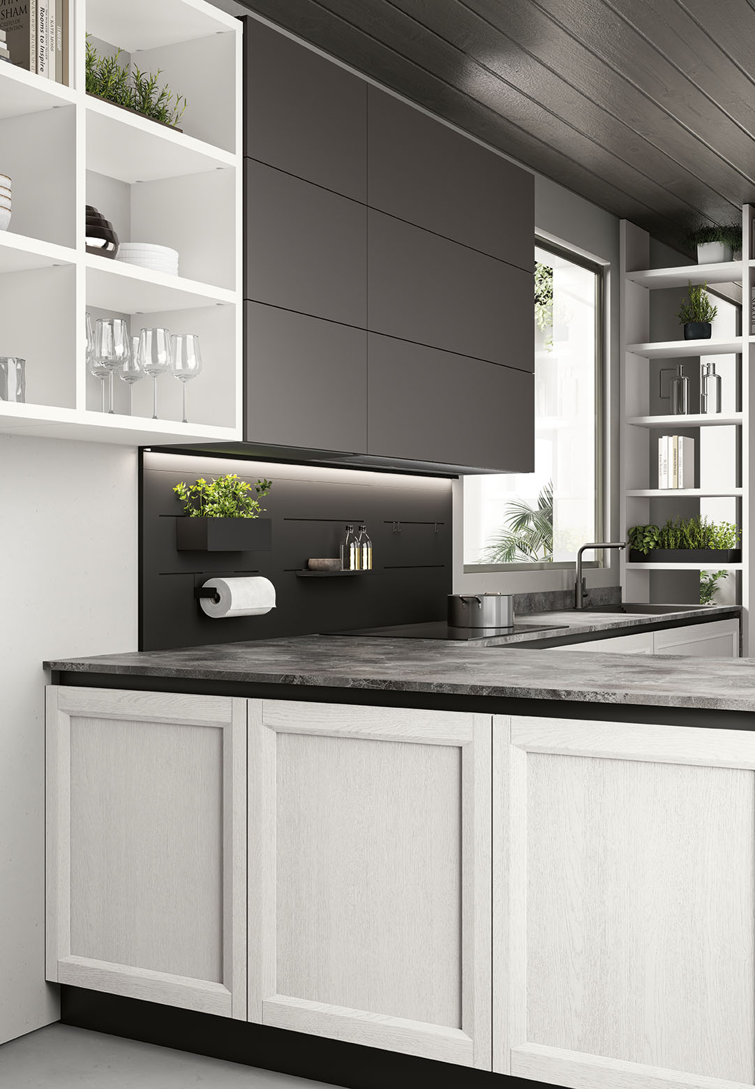 La cucina Pratica L si distingue per soluzioni raffinate e atmosfre proiettate verso il futuro, dove gli elementi decorativi evocano uno stile giocoso e si integrano armoniosamente nello spazio.